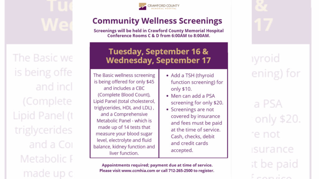 Crawford County Memorial Hospital is continuing its commitment to proactive, preventative care by offering Quarterly Community Wellness Screenings. These screenings make it easier—and more affordable—for area residents to stay on top of their health.